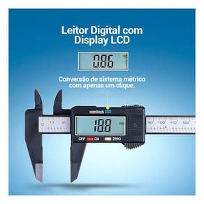 Deslocando o cursor móvel sobre a haste da ferramenta, as medições são mostradas no display lcd. Funciona com bateria LR44 (inclusa). O paquímetro possui botões para seleção de unidade de medida (milímetro ou polegada), botão liga/desliga e botão para zerar o mostrador na posição desejada. Display LCD de fácil visualização.