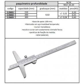 CAPACIDADE MEDIÇÃO: 300 MM; GRADUAÇÃO DE 0,02 MM; EXATIDÃO: / 0,04 MM; BASE DE APOIO: 100 MM; FABRICADOS EM AÇO INOXIDÁVEL TEMPERADO; CURSOR MONOBLOCO; ESCALA E CURSOR COM ACABAMENTO CROMADO FOSCO; PARAFUSO DE FIXAÇÃO DA MEDIDA; SEM GANCHO.