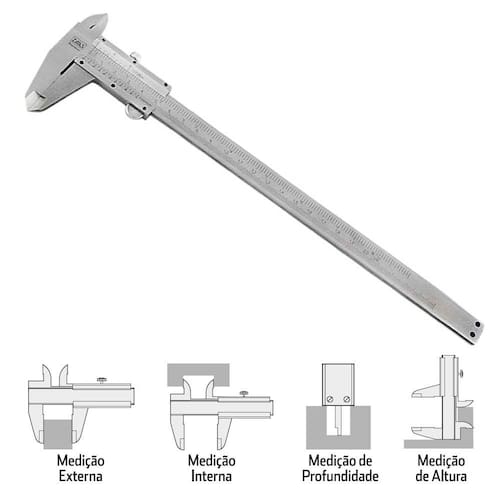 Instrumento de Metrologia Utilizado para medir as dimensões lineares, internas, externas e de profundidade de uma peça. Ideal para fazer medições precisas, tanto para em oficinas, escolas, indústrias e comércio ou uso doméstico ou hobby. Fabricado em aço inox Possui trava e medidor de profundidade Capacidade de medição de 0 a 200mm Graduação superior: 1/128" Graduação inferior: 0,05 mm Exatidão de aproximadamente +-0,05mm Acondicionado em estojo plastico Marca: Não Informado Ean: 7898469660094