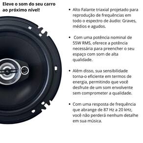 Par de Alto Falantes Triaxial 6 Polegadas 110w Rms 4Ohms Para Carros Kit par de alto-falantes triaxial 6 polegdas 110w Rms 4Homs Seu carro merece o Kit de alto-falantes mais vendido do Brasil, chega de sofrer com os chiados na sua música, adquira este produto e dê um fim nesse problema. Composto por 02 alto-falantes 6 polegadas. Eles são perfeitos para você curtir suas músicas favoritas enquanto dirige. Com 110w RMS de potência eles podem ser instalados nas portas dianteiras, traseiras, tampão e painel com ou sem adaptações. Além do seu desempenho extraordinário, é uma fusão de estilo e durabilidade, este triaxial adapta-se a uma ampla variedade de gostos musicais, oferecendo uma experiência auditiva personalizada e imersiva. - Especificações Técnicas: borda: Borracha diâmetro nominal: 6 Polegadas impedância nominal: 4 Ohms potência nominal RMS : 55W cada potência de pico: 110W resposta de frequência -10 dB: 87 a 20kHz sensibilidade 1W1m : 83,34 db SPL cone: Polipropileno tipo: Triaxial Sub, médio e tweeter marca: First Option - Parâmetros: FS: 114,10 Hz vas: 4.39 0.16 l ft qts: 3,27 qes: 4,61 qms: 11,20 no half space : 0,14 % sd: 0.013 20.57 m in vd Sd x Xmax : 27.39 1.67 cm in BL: 2,63 Tm re: 4,04 Ohms para DVC, considerar bobinas em série mms: 11.04 0.02 g lb cms: 176,00 um/N rms: 0,71 kg/s xmax: 2.08 0.08 mm in xlim desloc. Máx. pico antes do dano : 6 0.24 mm in hvc altura do enrolamento da bobina : 6 0.24 mm in hag altura do gap : 3.7 0.15 mm in le 1 kHz indutância da bobina em 1 kHz : 0,23 mH freq. Corte mínima recomendada: 95,00 Hz - Conteúdo da Embalagem: 01 x Par de alto falantes 6 polegadas 55W RMS cada de Fábrica: 3 meses de contra defeitos de fabricação. Marca: Não Informado Ean: 7891902506850