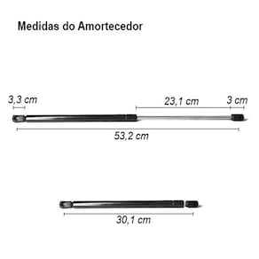 Pesos e medidas (aproximados) Comprimento fechado de centro a centro de montagem: 30,3 cm Comprimento aberto de centro a centro de montagem: 53,5 cm Curso: 23,2 cm Força de expansão: 330 N Medidas da embalagem: 6 x 6 x 36 cm (altura x largura x comprimento) Peso bruto: 0,70 Kg