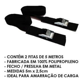 Especificações técnicas: Composição: 100% polipropileno 25mm Presilha: metal zamak de 25mm Capacidade de carga: 70kg para amarração Medidas: 5m x 2,5 cm cada fita. Peso: 0.30 kg Garantia: 3 meses