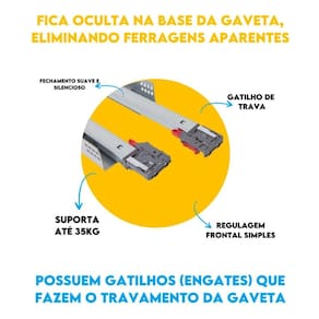 Possui sistema Soft Closing Gaveta aberta, fecha no amortecimento seguro e sem ruídos, ideal para gavetas de armários, escrivaninhas, cômodas e móveis compactos. 35cm - Perfeito para gavetas menores e nichos compactos.