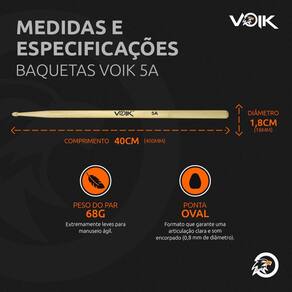 Especificações • Marca: Voik • Modelo: 5A • Madeira: Maple • Formato da Ponta: Oval • Diâmetro da baqueta: 1,8 mm • Diâmetro da ponta da baqueta: 0,8 mm • Comprimento: 40 cm • Peso do par: 68 g