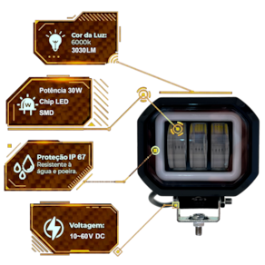 Permite excelente visualização seus percursos e caminhos, devido aos seus LEDs de alto brilho com potência de 30W cada. Nunca mais passe por sufocos em caminhos perigosos, sem iluminação ou estradas com neblina.