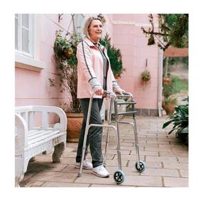 - Transforma um andador fixo em um andador móvel. - Par de rodas de uso universal, servindo em diversos modelos de andadores fixos/articulados. - Fácil manuseio, engate rápido e sistema mola-trave. - Maior durabilidade - Produto haste em alumínio anodizado, não risca e não perde o brilho. - Acompanham o ajuste de 08 níveis de regulagem de altura no Andador Dellamed