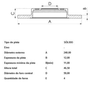 CARACTERÍSTICAS: Dianteiro Sem Cubo Sólido Diâmetro externo A 240,00 Espessura da pista B 12 Espessura mínima da pista TH(min) 11 Altura total C 46,50 Diâmetro do furo central D 59,00 Quantidade de furos E 4