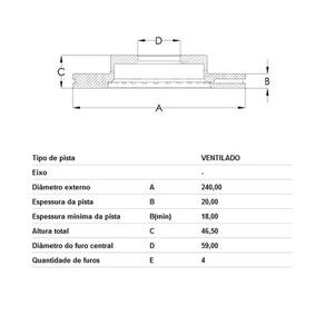CARACTERÍSTICAS: Dianteiro Sem Cubo Diâmetro externo A 240 Espessura da pista B 20 Espessura mínima da pista TH (min)18 Altura Total C 46,50 Diâmetro do furo central D 59 Quantidade de furos E 4