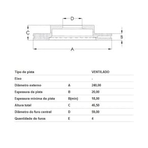 CARACTERÍSTICAS: Dianteiro Sem Cubo Diâmetro externo A 240 Espessura da pista B 20 Espessura mínima da pista TH (min)18 Altura Total C 46,50 Diâmetro do furo central D 59 Quantidade de furos E 4
