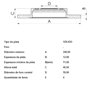CARACTERÍSTICAS: Dianteiro Sem Cubo Sólido Diâmetro externo A 240,00 Espessura da pista B 12 Espessura mínima da pista TH(min) 11 Altura total C 46,50 Diâmetro do furo central D 59,00 Quantidade de furos E 4