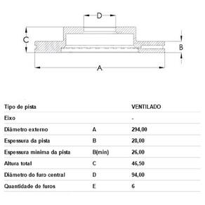CARACTERÍSTICAS: Dianteiro Ventilado Sem Cubo Diâmetro externo A 294 Espessura da pista B 28 Espessura mínima da pista TH(min)26 Altura total C 46,50 Diâmetro do furo central D 94,02 Quantidade de furos E 6