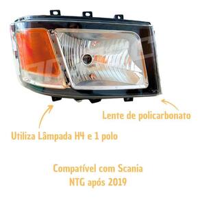 Par de farol principal compatível com caminhões scania ntg após 2019Modelo lâmpadaLado esquerdo motorista + lado direito passageiro Lente policarbonato super resistenteUtiliza lâmpadas h4 e 1 polo-------------------------------------------------- a ampec autopeças não se responsabiliza pelo mau uso ou instalação indevida do produto, sempre recomendamos que a instalação seja feita por um profissional especializado.- o produto é novo Sim, não trabalhamos com produtos usados, remoldados ou remanufaturados.-tem disponibilidade do produto Temos disponibilidade de todos nossos produtos enquanto durarem os estoques, favor nos consultar antes da compra.- imagem ilustrativa utilizada para identificação e demonstração de produto.- as marcas e modelos citadas no anúncio, pertencem aos seus respectivos fabricantes, somente mencionadas como referências para o uso correto do produto, conforme artigo 31 da lei: 8078 de 11.09.1990 Não temos qualquer vínculo com estas empresas.