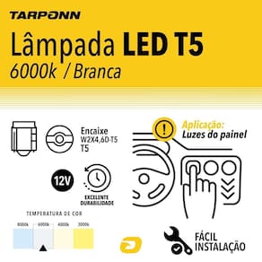 Características:compactamodernabaixo consumoAlta durabilidadeIluminação VerdeFácil instalaçãoAplicação: Painel de carroO melhor custo-benefício em iluminação automotiva está aqui com a Lâmpada Tarponn LED Pinguinho T5-COB 12vBastante compacta em seu tamanho, é ideal para ser aplicada no painel do seu carro, promovendo mais modernidade no visual.Além de possuir baixo consumo, sua durabilidade é bem superior comparado com as lâmpadas convencionais.Agora sim você terá mais economia na sua iluminação automotiva com a Lâmpada Tarponn LED Pinguinho T5-COB 12vFicha técnica:Cor: VerdeTemperatura de Cor: -Encaixe: W2X4,6D-T5Tensão: 12vEquivalência: 3wTipo de LED: COBLinha: StandardQuem somos:Somos a Mega GT especialistas na linha de Acessórios Automotivos e Utilidades para a sua casa. Buscamos sempre oferecer para o nosso cliente a melhor opção com o preço justo na sua compra.4- Tem garantiaSim, os produtos têm garantia de 3 meses. Ean: 7900469450510