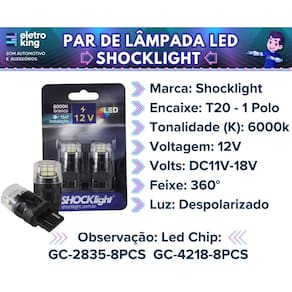 • Marca: Shocklight • Encaixe: T20 - 1 Polo • Tonalidade (K): 6000k • Voltagem: 12V • Volts: DC11V-18V • Feixe: 360° • Uso: Luzes de freio, luzes de ré, luzes de piscas, luzes de neblina. • Luz: Despolarizado • Input (A) 13.5V: 0.5A±0.06A