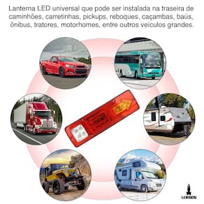 As Lanternas Sinaleiras Traseiras LED da Lorben foram projetadas para melhorar a segurança e o estilo de veículos grandes como caminhões, carretinhas, pickups, reboques, caçambas, baús, ônibus, tratores ou esteiras. Modelo universal compatível com a maioria dos veículos equipados com fonte de alimentação DC 12V ~ 24V.