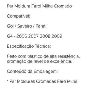 Descrição do produto Par moldura farol milha cromado gol parati saveiro Mais informações Marca: 60249 Descrição completa Par moldura farol milha cromado gol parati saveiro g4 Par moldura farol milha cromado Compatível: Gol / saveiro / parati Especificação técnica: Feito com plastico de alta resistência, cromação de nível de excelência. Conteúdo da embalagem: Par molduras cromadas farol milha Valor referente ao par de 3 meses Obs: recomendamos que a instalação seja feita por um profissional, pois não nós responsabilizamos pelo mau uso da peça. Agradecemos a sua visita Marca: Não Informado