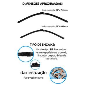 ESPECIFICAÇÕES TÉCNICAS: - Haste em plástico semirrigido que se ajusta ao vidro; - Fita de borracha; - Proporciona maior aderência e limpeza; - Evita riscos no vidro; - Menos ruídos no seu funcionamento; - Fácil de instalar; - Excelente durabilidade e acabamento; - Lado do motorista com 28 Polegadas 710mm ; - Lado do passageiro com 26 Polegadas 660mm ; - Para veículos com encaixe tipo TL1; - Substitui a palheta convencional; - Peso: 200 gramas.