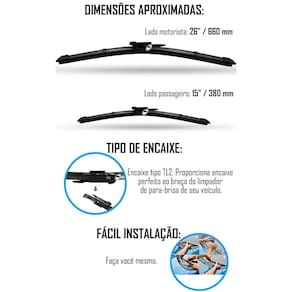 ESPECIFICAÇÕES TÉCNICAS: - Haste em plástico semirrigido que se ajusta ao vidro; - Fita de borracha; - Proporciona maior aderência e limpeza; - Evita riscos no vidro; - Menos ruídos no seu funcionamento; - Fácil de instalar; - Excelente durabilidade e acabamento; - Lado do motorista com 26 Polegadas 660mm ; - Lado do passageiro com 15 Polegadas 380mm ; - Para veículos com encaixe tipo TL2; - Substitui a palheta convencional; - Peso: 250 gramas.