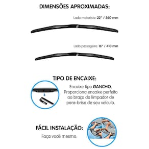 ESPECIFICAÇÕES TÉCNICAS: - Haste em plástico semirrigido que se ajusta ao vidro; - Fita de borracha; - Proporciona maior aderência e limpeza; - Evita riscos no vidro; - Menos ruídos no seu funcionamento; - Fácil de instalar; - Excelente durabilidade e acabamento; - Lado do motorista com 22 Polegadas 560mm ; - Lado do passageiro com 16 Polegadas 410mm ; - Para veículos com encaixe tipo GANCHO; - Substitui a palheta convencional; - Peso: 200 gramas.