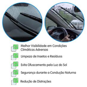 CARACTERÍSTICAS: - Melhor Visibilidade em Condições Climáticas Adversas: O limpador para-brisa ajuda a remover chuva, granizo, poeira e sujeira do para-brisa, melhorando a visibilidade do motorista em condições climáticas adversas; - Limpeza de Insetos e Resíduos: Com o auxílio do esguicho de água, remove facilmente insetos, resíduos de pássaros e outras sujeiras que podem se acumular no para-brisa durante a condução; - Evita Ofuscamento pela Luz do Sol: Ajuda a manter o para-brisa livre de manchas e reflexos causados pela luz solar direta, o que pode atrapalhar a visão do motorista; - Segurança durante a Condução Noturna em Chuvas: Garante que o para-brisa esteja limpo e claro durante a condução noturna, melhorando a segurança nas estradas. - Manutenção Preventiva: A manutenção regular dos limpadores para-brisa pode prolongar a vida útil do para-brisa, evitando riscos e danos causados por sujeira acumulada. - Redução de Distrações: Evita que o motorista se distraia ao tentar limpar manualmente o para-brisa, permitindo que ele se concentre na direção. - Conforto do Motorista e Passageiros: Proporciona um ambiente mais confortável para motoristas e passageiros, mantendo o para-brisa limpo e livre de obstruções visuais.