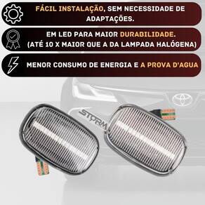 Par Pisca Seta Corolla Fielder Transparente ano 2005 a 2015 Cor: Cristal Descrição: Somos a Storm Parts, vendemos peças importadas e nacionais de alta qualidade e com , seu carro merece o melhor, ele merece as peças da Storm Parts. Compatível com: Toyota Hilux Sr Srv 2005 até 2015 Toyota Hilux Sw4 2005 até 2011 Toyota Corolla 2002 até 2008 Toyota Corolla Fielder 2002 até 2008 - Obs: compatível com as versões que possuem a seta no para-lama Especificações: Condição: novo com . Origem: Tipo: Pisca de direção lateral, acendimento sequencial Cor luz LED: âmbar Cor externa: Fume e Cristal escolher modelo desejado Potência: 3W Tensão: 12V Material: Caixa ABS + luzes LED Modelo: luz led Principais Perguntas: P. Necessita adaptação para instalar P. Acusa algum erro no painel do carro P. Anuncio é referente a uma unidade o par R. Anuncio referente ao par Lado direito + Lado esquerdo P. Qual a condição do produto R. Vendemos somente produtos novos e lacrados Apesar de fácil Instalação recomendamos a instalação por um profissional. Tenha tranquilidade de comprar com quem está disposto a oferecer o melhor atendimento, caso precise de ajuda antes ou após a compra, conte com a nossa equipe de atendimento para lhe ajudar. Estamos sempre a disposição para tirar qualquer duvida.