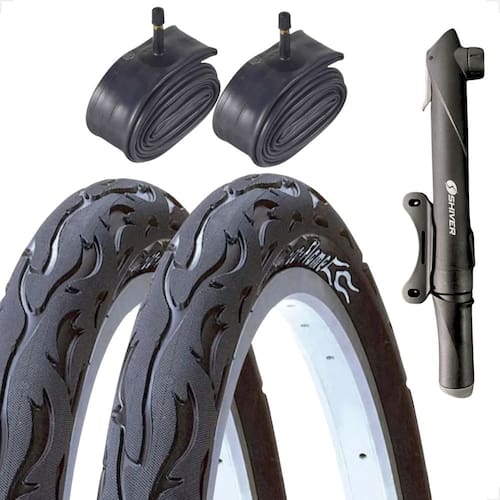 Itens inclusos: 2 unidades Pneu kenda Flame aro 26x2.125 2 unidades Camara de ar aro 26 SHIVER Bico grosso 33mm 1 unidade mini bomba de ar manual Shiver quadro