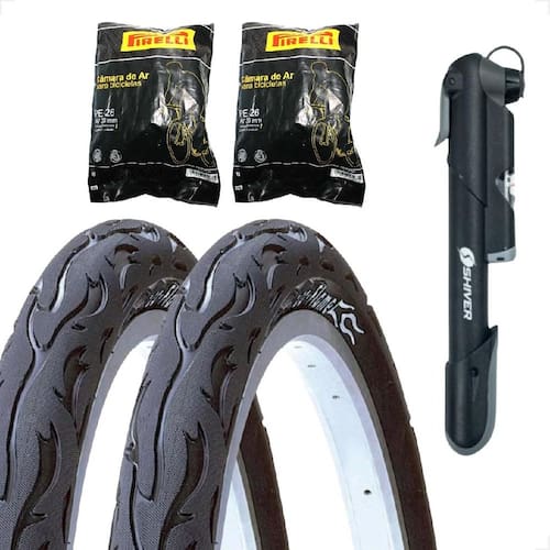 Itens inclusos: 2 unidades Pneu kenda Flame aro 26x2.125 2 unidades Camara de ar aro 26 Pirelli Bico grosso 33mm 1 unidade mini bomba de ar Shiver portatil com manometro