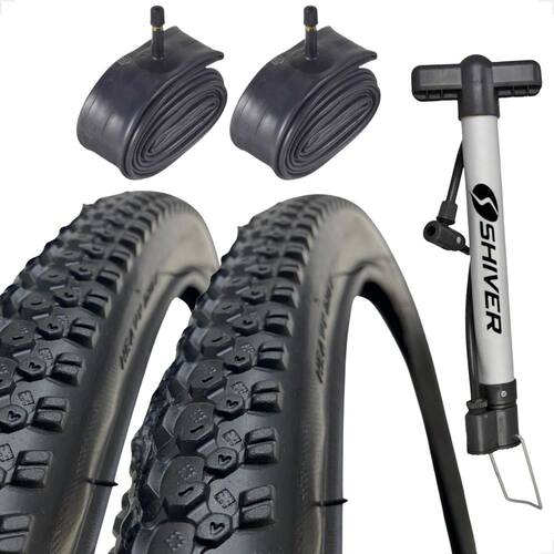 2 unidades pneu Shiver 26x1.95 modelo rocky 2 unidades camara de ar aro 26 33mm bico grosso 1 unidade bomba de ar manual Shiver 30cm