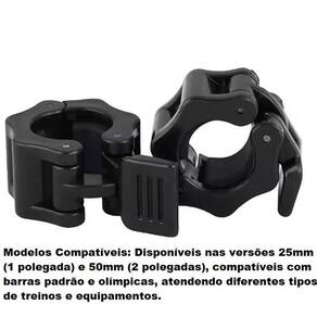 Par de Presilhas 25mm e 50mm para Barra, Anilha e Halter - Academia Garanta segurança e estabilidade nos seus treinos com o Par de Presilhas para barras de 25mm e 50mm. Indispensáveis para evitar o deslizamento das anilhas durante os exercícios, elas oferecem firmeza, praticidade e durabilidade para o seu treino em casa ou na academia. Características: Fixação Segura: Desenvolvidas para manter as anilhas firmemente presas à barra, evitando movimentos indesejados e garantindo treinos mais seguros e estáveis. Modelos Compatíveis: Disponíveis nas versões 25mm 1 polegada e 50mm 2 polegadas , compatíveis com barras padrão e olímpicas, atendendo diferentes tipos de treinos e equipamentos. Material Resistente: Fabricadas em ABS, oferecem excelente durabilidade e resistência ao uso frequente. Fácil Manuseio: Sistema de trava simples e eficiente, que permite colocar e remover rapidamente com uma única mão. Leves e Compactas: Fáceis de guardar e transportar, ideais para quem treina em casa ou leva seus próprios acessórios para a academia. Versatilidade de Uso: Pode ser Utilizado em barras de supino, halteres, barras W, barras olímpicas e demais equipamentos de musculação. Adicione mais segurança ao seu treino com o Par de Presilhas para Barras. Qualidade profissional para você treinar com confiança Especificações: Itens inclusos: 1 par de presilhas 2 unidades Tamanhos disponíveis: 25mm barra padrão ou 50mm barra olímpica Material: ABS Marca: Não Informado