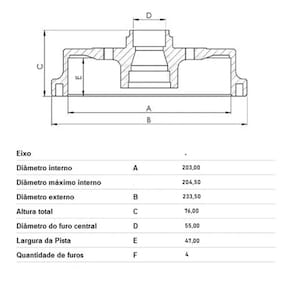 CARACTERÍSTICAS: Traseiro Com Cubo Diâmentro interno A 203,00 Diâmetro máximo interno TH (min) 204,50 Diâmetro externo B 233,50 Altura total C 76,00 Diâmetro do furo central D 55 Lagura da pista E 47,00 Quantidade de furos F 4