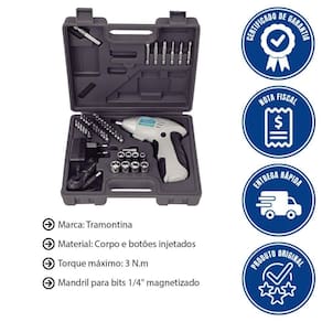 - Chega de brigar com as chaves de fenda! A Parafusadeira Tramontina 1/4 de Polegada para Uso Doméstico a Bateria Ni-Cd 4,8 V com Maleta e 46 Peças é ideal para o trabalho de apertar e soltar parafusos em madeiras.