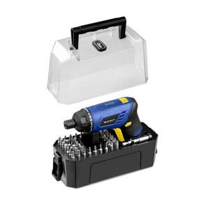 Parafusadeira Angular Michelin 4v Com Lanterna + Kit 50 Bits Parafusadeira Articulada Michelin MI001 4V Com 50 Peças Descrição:A Parafusadeira Articulada MI001 4v Michelin é ideal para realizar manutenções gerais do dia a dia, como apertar ou soltar parafusos em madeiras, plásticos, desmontagens de aparelhos e móveis.Além disso, acompanha maleta com acessórios. Para garantir maior conforto, a parafusadeira possui um design ergonômico, com pegada emborrachada. Características: - 16 níveis de torque;- Bateria de lítio 1300MAH;- LED indicador de bateria;- Luz auxiliar;- Cabo com posição ajustável;- 210 RPM.