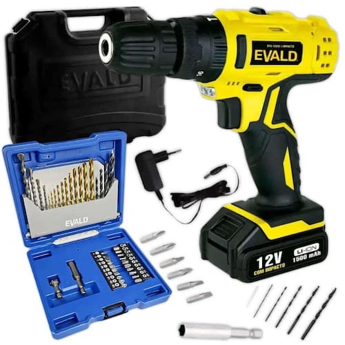 Parafusadeira Bateria 12V Impacto Bivolt PFE-012EVI com Kit de Brocas 41 Peças EV-EBB41 EVALD