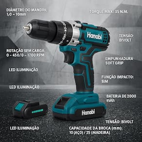 Características Técnicas: Tensão: 21V (Bivolt) Bateria: Íons de Lítio 2000mAh Torque máximo: 35 N·m Ajustes de torque: 18 + 3 posições Rotação sem carga: 0–450 / 0–1700 RPM Função impacto: Sim Diâmetro do mandril: 1,0 – 10 mm Capacidade da broca: 10 mm (aço) / 25 mm (madeira) Empunhadura: Soft Grip antiderrapante Iluminação: LED embutido para trabalhos em locais com pouca luz Modelo: LWJ-272