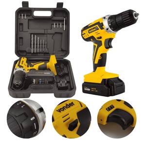 Parafusadeira/furadeira a bateria 20V fonte de carregamento bivolt automática PFV238 VONDER Indicada para soltar e apertar parafusos de até 8 mm de diâmetro e fazer furos em madeiras ou metais. Acompanha acessórios encaixados perfeitamente na maleta, conferindo organização, praticidade e maior vida útil dos acessórios. Possui regulagem para 18 posições de torque e 1 posição para perfuração.