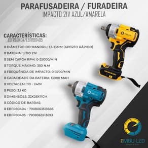 Acompanha na maleta (EBFR80404): - 1 Parafusadeira/Furadeira de Impacto EmbuLED 21V - 2 Baterias recarregáveis - 1 Carregador bivolt - Conjunto de brocas (6 pcs) - Conjunto de pontas (6 pcs) - Conjuntos de soquetes (4 pcs e 5 pcs – 14 a 22mm) - Soquete de impacto, chave e conversor para mandril - Eixo flexível universal - Lubrificante e acessórios extras