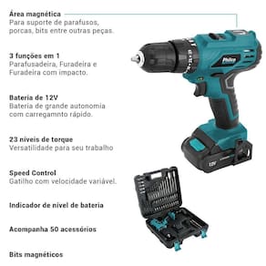 Além de potência e eficiência, graças a bateria de Lítio de 12V e 1500mAh e 23 controles de torque de 20Nm, a Parafusadeira Philco ainda possui mandril de 10mm, de aperto rápido, sendo fácil encaixar e desencaixar a broca. 3 em 1, atua como Parafusadeira, Furadeira e Furadeira com Impacto.