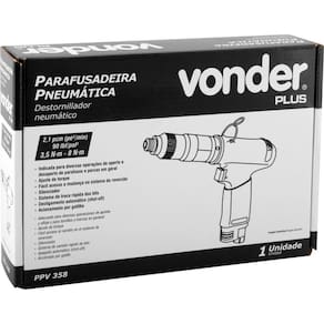 Marca: VonderConteúdo da embalagem:1 Parafusadeira. Acompanha: 1 gancho para balancim e 1 chave para ajuste do torque.Destaques e diferenciais:Possui ajuste de torque, fácil acesso a mudança no sistema de reversão e silenciador. Conta com sistema de troca rápida dos bits e desligamento automático Shut-off , garantindo maior segurança e agilidade na operação. Conta com acionamento por gatilho. Ergonômica, proporciona conforto e praticidade ao operador.Aplicações e dicas de uso:Indicada para diversas operações de aperto e desaperto de parafusos e porcas em geral. Uso industrial. Mantenha a ferramenta constantemente lubrificada e utilize sempre o regulador e o lubrificador de linha com óleo pneumático. .Detalhes TécnicosModelo: PPV358 Consumo de ar: 2,1 pcm pé/min Pressão de trabalho: 90 lbf/pol Tipo do encaixe da parafusadeira: Sextavado - 1/4 - 6,35 mm Tipo de acionamento: Acionamento por gatilho Sistema de reversão: Sim Rotações por minuto rpm : 1.000/min Torque: 3,5 N.M - 8,0 N.M Rosca de entrada de ar: 1/4 NPT fêmea Diâmetro da mangueira: 3/8 Aceleração transmitida nas mãos - braços do operador - ah: 0,61 m/s Incerteza da aceleração transmitida nas mãos - braços do operador - k: 0,56 m/s Massa aproximada peso kg : 1,236 kg - E CDC : legal: 90 dias + contratual: 3 meses Para locadoras, única e exclusiva de 90 dias Marca: Não Informado