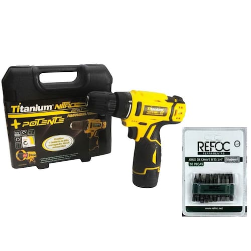 A Parafusadeira furadeira 3/8 pol. a bateria possui regulagem para 18 posições de torque e 1 posição para perfuração, botão de sentido horário e anti horário de rotação e mandril de aperto rápido com ajuste de torque, perfuração. Com led para melhor visibilidade, seletor de reversão da rotação e de acionamento. Acompanha: 1 bateria 1.3 ah 1 carregador bivolt 1 maleta Especificações Técnicas: Velocidade de giro sem carga: 0 550 rpm Mandril: 10 mm Ponteiras: Fenda: 5 e 6, ph1, ph2, pz1, pz2 Medida: 190 x 190 x 40 cm Peso: 0,960 Kg : 6 meses Marca: titanium do brasil Marca: Não Informado