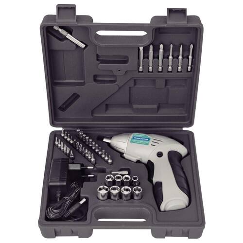 Chega de brigar com as chaves de fenda! A Parafusadeira Tramontina 1/4 de Polegada para Uso Doméstico a Bateria Ni-Cd 4,8 V com Maleta e 46 Peças é ideal para o trabalho de apertar e soltar parafusos em madeiras. Possui diversos acessórios para atender às suas necessidades em diferentes situações. O LED para iluminação facilita a operação e a bateria embutida garante mais flexibilidade. O carregador é bivolt.