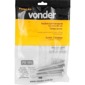 Marca: VonderConteúdo da Embalagem:1 Cartela com 3 parafusosDestaques e diferenciais:Possui acabamento zincado que aumenta a resistência contra corrosão/oxidação. Conta com cabeça base plana que oferece melhor fixação.Aplicações e dicas de uso:Indicado para fixações de acessórios e objetos em paredes de alvenaria e concreto com buchas de fixação. Permite fixações em móveis tubulares, equipamentos fabricados com chapas metálicas finas e esquadrias de alumínio. Muito utilizado na fabricação de móveis em madeira e MDF.Características Técnicas:Material do parafuso autoatarraxante: Aço carbono Acabamento do parafuso autoatarraxante: Zincado Diâmetro da rosca do parafuso autoatarraxante: 6,3 mm Comprimento do parafuso autoatarraxante: 50,0 mm Tipo da cabeça do parafuso autoatarraxante: Panela Tipo da fenda do parafuso autoatarraxante: Simples Marca: Não Informado Ean: 7893946625306