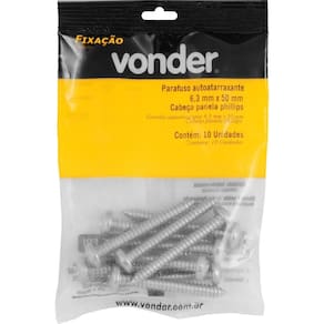 Marca: VonderConteúdo da Embalagem: 1 Cartela com 10 parafusosDestaques e diferenciais:Possui acabamento zincado que aumenta a resistência contra corrosão/oxidação, além de cabeça tipo phillips, que proporciona maior força de aperto e menor possibilidade da chave ou bits escapar e riscar a peça que está sendo trabalhada.Aplicações e dicas de uso:Indicado para fixações de acessórios e objetos em paredes de alvenaria e concreto com buchas de fixação. Permite fixações em móveis tubulares, equipamentos fabricados com chapas metálicas finas e esquadrias de alumínio. Muito utilizado na fabricação de móveis em madeira e MDF.Características Técnicas:Material do parafuso autoatarraxante: Aço carbono Acabamento do parafuso autoatarraxante: Zincado Diâmetro da rosca do parafuso autoatarraxante: 6,3 mm Comprimento do parafuso autoatarraxante: 50,0 mm Tipo da cabeça do parafuso autoatarraxante: Panela Tipo da fenda do parafuso autoatarraxante: Phillips fenda cruzada Marca: Não Informado Ean: 7893946625450