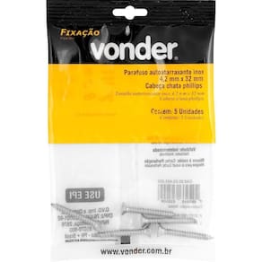 Marca: VonderConteúdo da Embalagem:1 Cartela com 5 parafusosDestaques e diferenciais:Fabricado em aço inox, proporcionando excelente resistência contra corrosão/oxidação. Conta com cabeça chata/cônica que oferece acabamento rente à superfície.Aplicações e dicas de uso:Indicado para fixações de acessórios e objetos em paredes de alvenaria e concreto com buchas de fixação. Permite fixações em móveis tubulares, equipamentos fabricados com chapas metálicas finas e esquadrias de alumínio. Muito utilizado na fabricação de móveis em madeira e MDF.Características Técnicas:Material do parafuso autoatarraxante: Inox Acabamento do parafuso autoatarraxante: N/A Diâmetro da rosca do parafuso autoatarraxante: 4,2 mm Comprimento do parafuso autoatarraxante: 32,0 mm Tipo da cabeça do parafuso autoatarraxante: Chata Tipo da fenda do parafuso autoatarraxante: Phillips fenda cruzada Marca: Não Informado Ean: 7893946625009