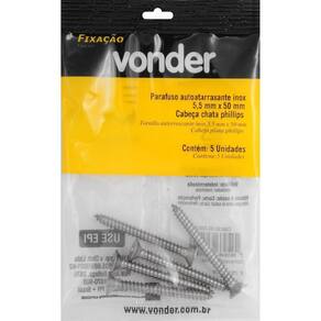 Marca: VonderConteúdo da Embalagem:1 Cartela com 5 parafusosDestaques e diferenciais:Fabricado em aço inox, proporcionando excelente resistência contra corrosão/oxidação. Conta com cabeça chata/cônica que oferece acabamento rente à superfície.Aplicações e dicas de uso:Indicado para fixações de acessórios e objetos em paredes de alvenaria e concreto com buchas de fixação. Permite fixações em móveis tubulares, equipamentos fabricados com chapas metálicas finas e esquadrias de alumínio. Muito utilizado na fabricação de móveis em madeira e MDF.Características Técnicas:Material do parafuso autoatarraxante: Inox Acabamento do parafuso autoatarraxante: N/A Diâmetro da rosca do parafuso autoatarraxante: 5,5 mm Comprimento do parafuso autoatarraxante: 50,0 mm Tipo da cabeça do parafuso autoatarraxante: Chata Tipo da fenda do parafuso autoatarraxante: Phillips fenda cruzada Marca: Não Informado Ean: 7893946625030
