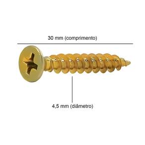Dimensões: 4,5 mm (diâmetro) x 30 mm (comprimento)Cabeça: Chata, para um acabamento discretoFenda: Phillips, que facilita a instalaçãoQuantidade: 500 unidades por embalagemMaterial: Aço de alta resistênciaAplicações: