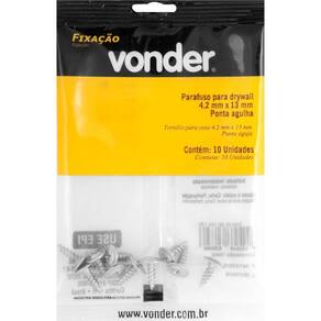 Parafuso Para Drywall 4,2X13Mm Ponta Agulha Com 10 Peças Vonder Marca: VonderConteúdo da Embalagem:1 Cartela com 10 parafusos para drywallDestaques e diferenciais:Possui acabamento zincado, proporcionando maior resistência contra oxidação/corrosão.Aplicações e dicas de uso:Indicado para fixações em drywallCaracterísticas Técnicas:Diâmetro da rosca do parafuso para drywall: 4,2 mm Comprimento do parafuso para drywall: 13,0 mm Material do parafuso para drywall: Aço carbono Marca: Não Informado Ean: 7893946626396