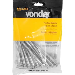 Marca: VonderConteúdo da Embalagem:1 Cartela com 10 parafusos madeiraDestaques e diferenciais:Possui acabamento zincado, proporcionando maior resistência contra oxidação/corrosão. Conta com cabeça chata/cônica que oferece acabamento rente à superfície.Aplicações e dicas de uso:Indicado para fixações em madeiras e derivados. Pode ser utilizado também em alvenaria com o auxílio de uma bucha. Possui acabamento zincado, proporcionando maior resistência contra oxidação e corrosão. Conta com cabeça chata cônica que oferece acabamento rente à superfície.Características Técnicas:Tipo de cabeça do parafuso madeira: Chata - fenda simples Diâmetro do parafuso madeira: 5,5 mm Comprimento do parafuso madeira: 75,0 mm Material do parafuso madeira: Aço carbono Marca: Não Informado