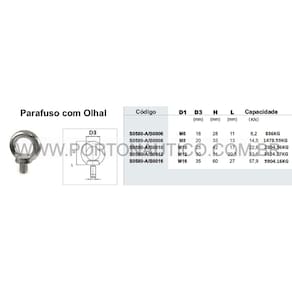 parafuso olhal macho em inox 316 rosca m10 argola reforçada parafuso olhal em inox com rosca descrição do produto em aço inox com parafusos de aço inoxidável resistência à corrosão, alta dureza. Função: pode ser utilizado em casa, ao ar livre, engenharia, fixação forte, máquinario entre outros. Marca: nautparts modelo: parafuso olhal diametro do cabo: 10 mm material: aço inox unidades por embalagem: 1