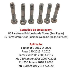 Parafuso Prisioneiro + Porca Coroa Fazer 250/lander 250 6 Pç Conteúdo da Embalagem: - 06 Parafusos Prisioneiro da Coroa Seis Peças - 06 Porcas Parafusos Prisioneiro da Coroa Seis Peças Aplicação: - Factor 150 2015 A 2020 - Fazer 150 2015 A 2020 - Xtz 250 Tenere 2010 A 2020 - Xtz 150 Crosser 2014 A 2020