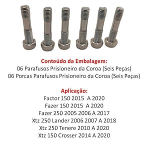 Parafuso Prisioneiro + Porca Coroa Fazer 250/lander 250 6 Pç Conteúdo da Embalagem: - 06 Parafusos Prisioneiro da Coroa Seis Peças - 06 Porcas Parafusos Prisioneiro da Coroa Seis Peças Aplicação: - Factor 150 2015 A 2020 - Fazer 150 2015 A 2020 - Xtz 250 Tenere 2010 A 2020 - Xtz 150 Crosser 2014 A 2020